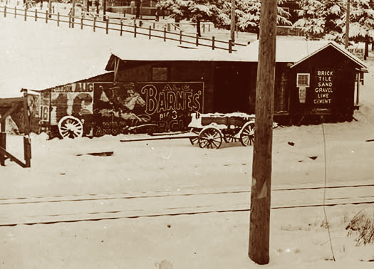 An enlargement of the building on the left of the first photo shows the two Oregon Electric tracks, a circus advertisement, and the businesses wares – brick, tile, sand, gravel, lime, and cement. The brick may have come from the Hillsdale brickyard, located near the southwest corner of Capitol Highway and Terwilliger Boulevard.