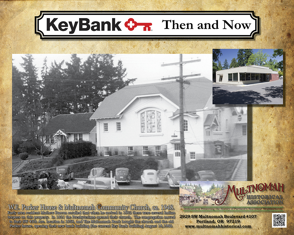 The caption reads: W.E. Parker House & Multnomah Community Church, ca. 1948. Early area resident Mathew Barron recalled that when he arrived in 1902 there were several Indian teepees on this property. In 1921 the Presbyterians opened their church. The congregation moved to their SW 45th Ave. location in 1958, and The Multnomah Bank bought the church and the old Parker house, opening their new bank building (the current Key Bank building) August 18,1960.
