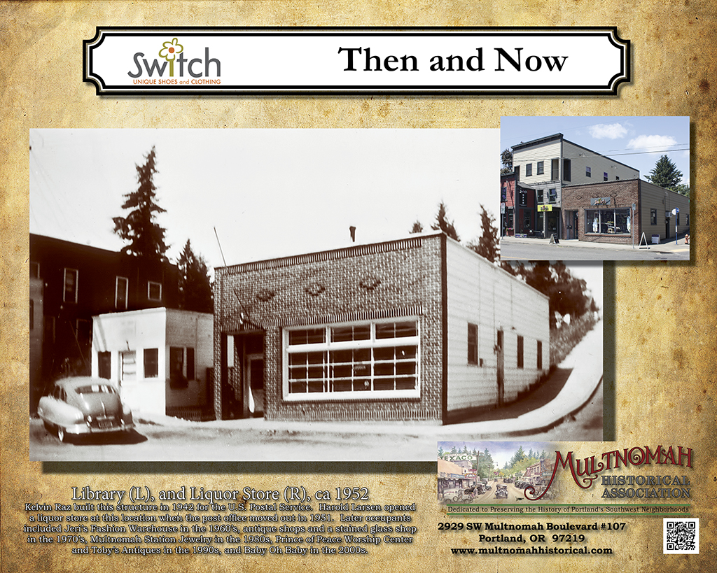 The caption reads: Kelvin Raz built this structure in 1942 for the U.S. Postal Service. Harold Larsen opened a liquor store at this location when the post office moved out in 1951. Later occupants included Jeri’s Fashion Warehouse in the 1960’s, antique shops and a stained glass shop in the 1970’s, Multnomah Station Jewelry in the 1980s, Prince of Peace Worship Center and Toby’s Antiques in the 1990s, and Baby Oh Baby in the 2000s.